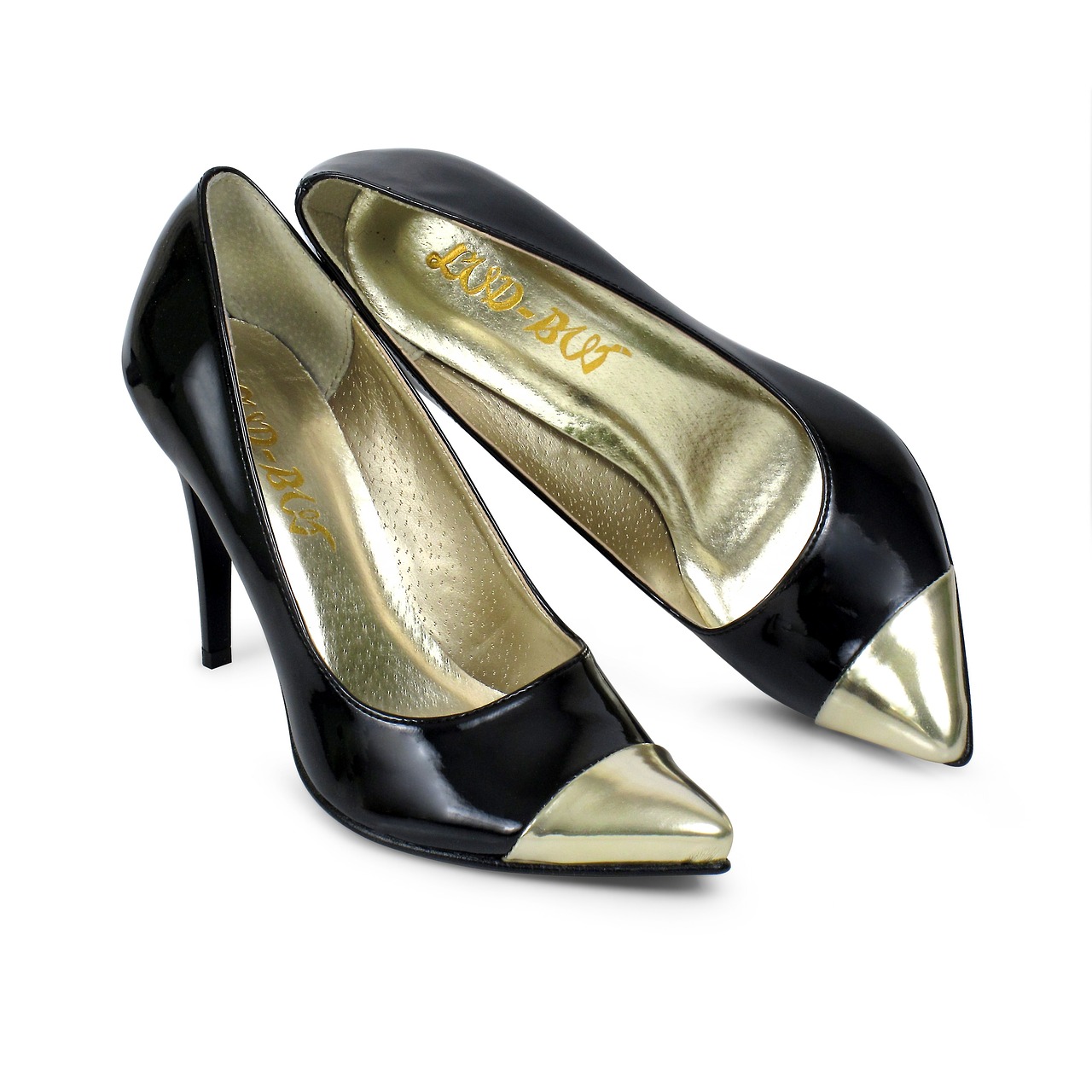 Elevate your style with these stunning black and gold high heels. Designed with a sleek glossy finish, a comfortable cushioned insole, and a pointed metallic toe cap for a sophisticated look. Ideal for formal events, parties, or a night out.